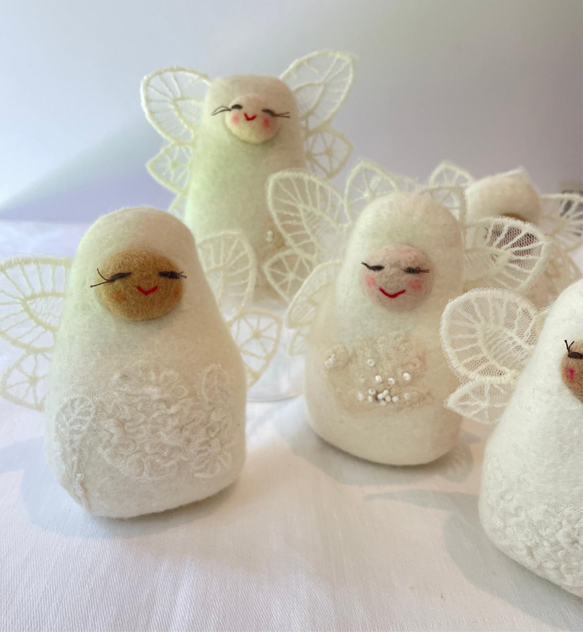 During this workshop you will learn to lay wool fleece, use a template to create a seamless 3 dimensional felted form, attach vintage lace with the nuno felting technique, make a solid ball and learn clever stitches to give your angel its own unique character. It will be something special to bring out every Christmas.
